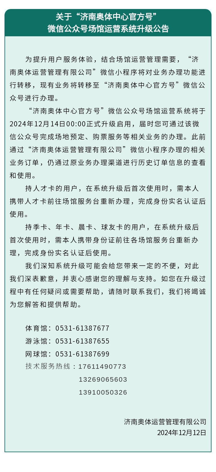 关于“济南奥体中心官方号”微信公众号场馆运营系统升级的公告